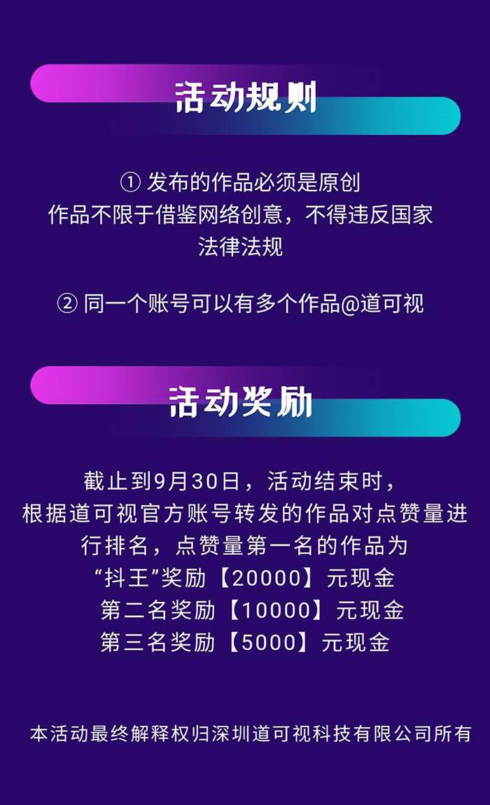9月30日活動(dòng)結(jié)束時(shí),根據(jù)道可視官方賬號(hào)轉(zhuǎn)發(fā)的作品對(duì)點(diǎn)贊量進(jìn)行排名,點(diǎn)贊量第一名的作品為“抖王”獎(jiǎng)勵(lì)【20000】元現(xiàn)金;第二名獎(jiǎng)勵(lì)【10000】元現(xiàn)金;第三名獎(jiǎng)勵(lì)【5000】元現(xiàn)金。